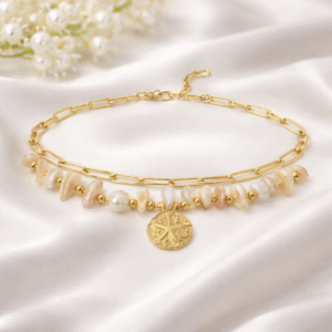 Inspired by sunlit shores and effortless elegance, the Aurelia Shoreline Layered Bracelet pairs sculptural gold links with luminous mother-of-pearl chips in a refined double-strand design. Finished with a textured sand-dollar medallion, this piece captures the poetry of the sea through a modern, elevated lens. Designed to drape delicately at the wrist, it balances organic beauty with polished sophistication—perfect for everyday luxury and timeless layering.