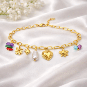 A radiant celebration of elegance and playfulness, the Étoile Heart & Pearl Charm Bracelet features a polished gold-tone stainless steel link chain adorned with an eclectic mix of high-shine charms. Delicate motifs including a heart, star, floral bloom, organic pearl drop, and vibrant enamel accents create a harmonious balance of color, texture, and symbolism. Designed to move gracefully with the wrist, this bracelet blends modern luxury with whimsical charm—perfect for elevating everyday looks or adding personality to evening ensembles.