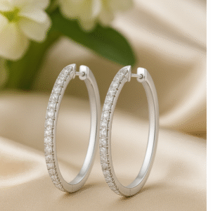 Crafted in premium 925 sterling silver, these sleek pavé hoops feature a fine row of brilliant-cut moissanite stones that deliver exceptional sparkle from every angle. Lightweight, minimal, and timeless—perfect for everyday elegance or refined evening wear.