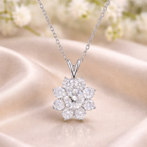 A radiant expression of timeless elegance, the Celestia Bloom Pendant features a brilliant round-cut moissanite at its heart, delicately surrounded by a halo of petal-like moissanite stones to form a refined floral silhouette. Expertly crafted in 925 sterling silver with premium platinum plating, the pendant offers exceptional brilliance, durability, and a mirror-like finish.