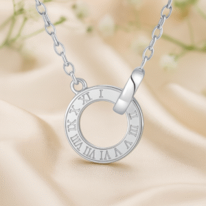 A refined blend of classic elegance and modern minimalism, this necklace features a polished Roman numeral circle pendant crafted in premium 925 Sterling Silver. The sleek rotating loop adds a graceful contemporary touch, symbolizing timeless connection and perpetual style.