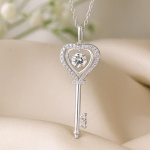 Unlock elegance with this beautifully crafted Heart Key Pendant, featuring a brilliant round-cut moissanite at the center of a delicate open-heart frame. Surrounded by shimmering micro-pavé stones, the design combines romance and sophistication. Expertly set in premium 925 sterling silver, this piece offers exceptional sparkle, durability, and timeless charm.