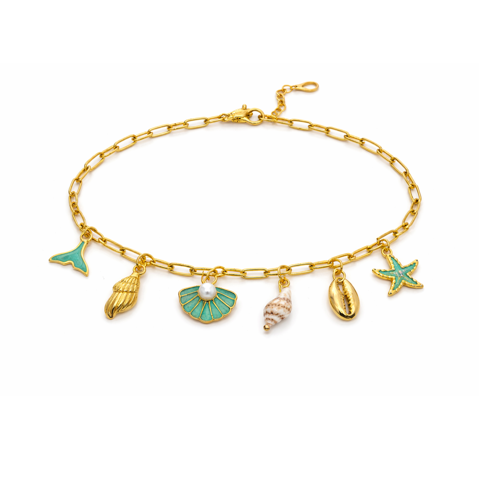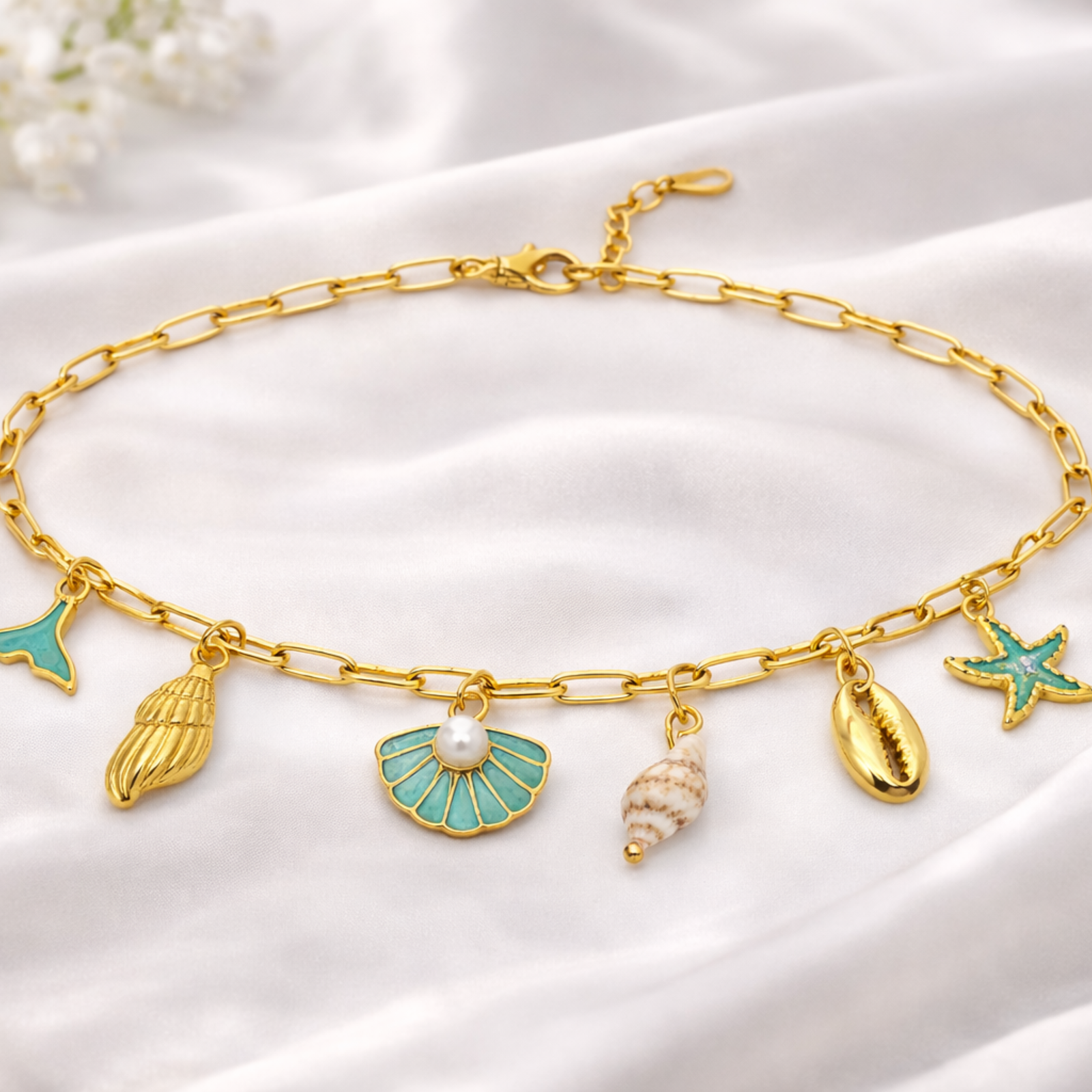 nspired by sun-kissed shores and tranquil seas, the Azure Coast Charm Bracelet is crafted in gold-tone stainless steel and adorned with an elegant arrangement of ocean-inspired charms. Featuring turquoise enamel accents, sculpted seashells, a starfish, mermaid tail, cowrie shell, and a pearl-centered shell motif, each element moves gracefully along the polished chain. The balanced mix of texture, color, and soft luster creates a refined yet playful silhouette—perfect for elevating resort wear, summer ensembles, and everyday luxury styling.