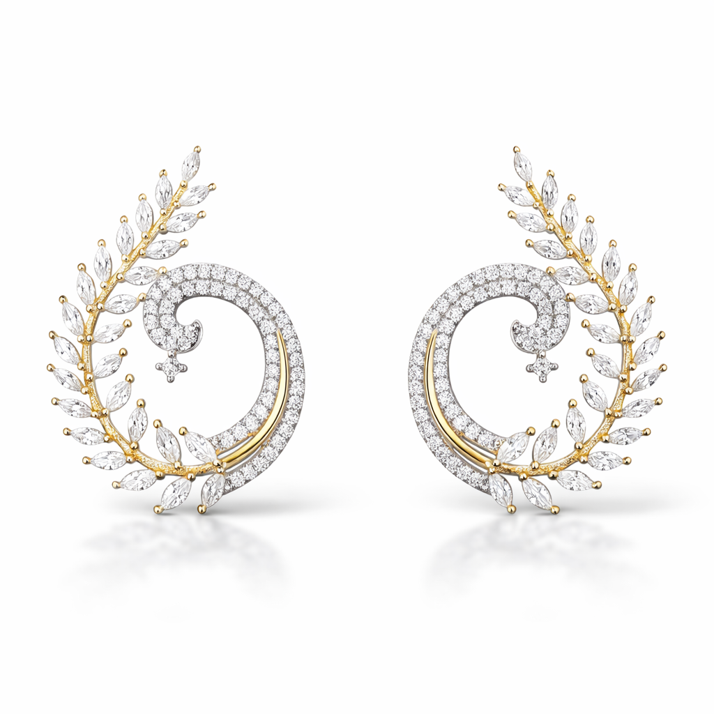 Crafted in radiant 925 Sterling Silver, this luxurious set features a delicately sculpted spiral silhouette adorned with pavé-set brilliant moissanites. A graceful marquise-cut diamond vine curves along the outer frame, creating movement, brilliance, and refined drama.