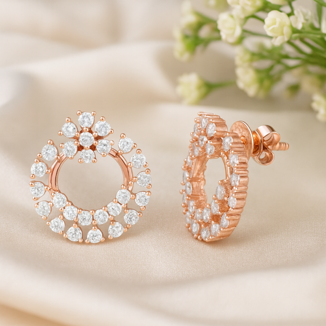 Each earring forms a dazzling open circle surrounded by meticulously set stones, creating dimension, luminosity, and a captivating sparkle that elevates both daytime and evening looks. The premium sterling silver core ensures durability, comfort, and long-lasting shine, while the rose-gold finish adds a soft romantic glow.