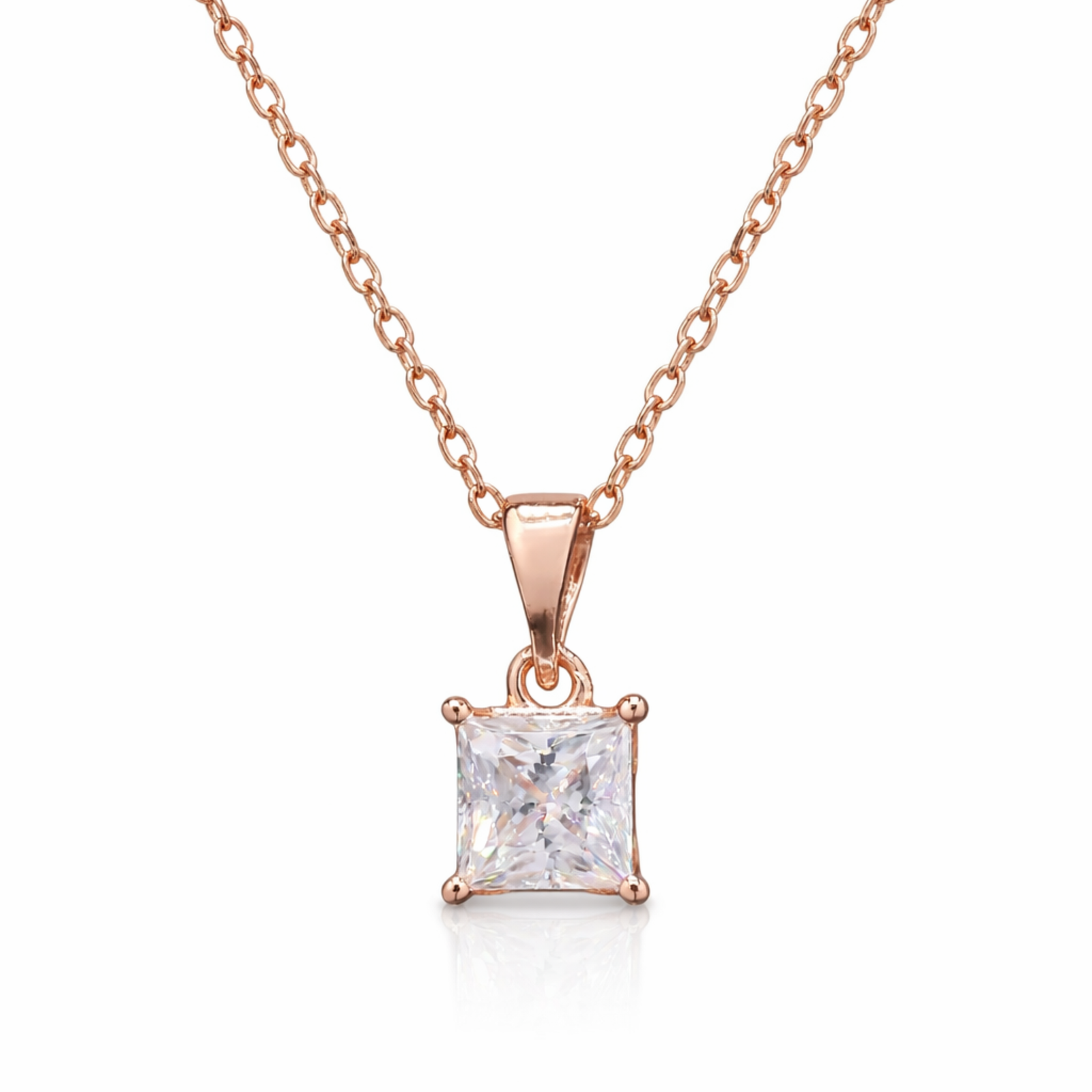 A study in timeless elegance, the Étoile Royale Pendant showcases a radiant princess-cut moissanite, exquisitely set in a warm rose-gold plated 925 sterling silver frame. The clean geometric silhouette highlights the stone’s exceptional fire and brilliance, capturing light from every angle with effortless sophistication.