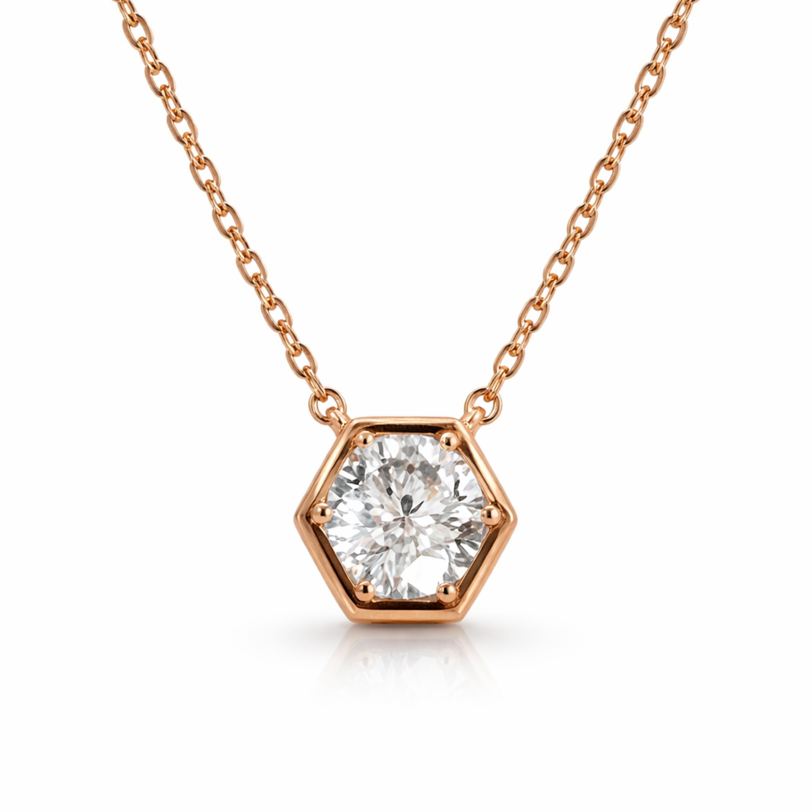 At its center, a brilliant-cut Moissanite gemstone radiates exceptional fire and clarity, secured within a polished rose gold-tone setting that enhances its luminosity. The clean hexagon silhouette offers a contemporary edge, while the delicate chain ensures effortless everyday elegance.