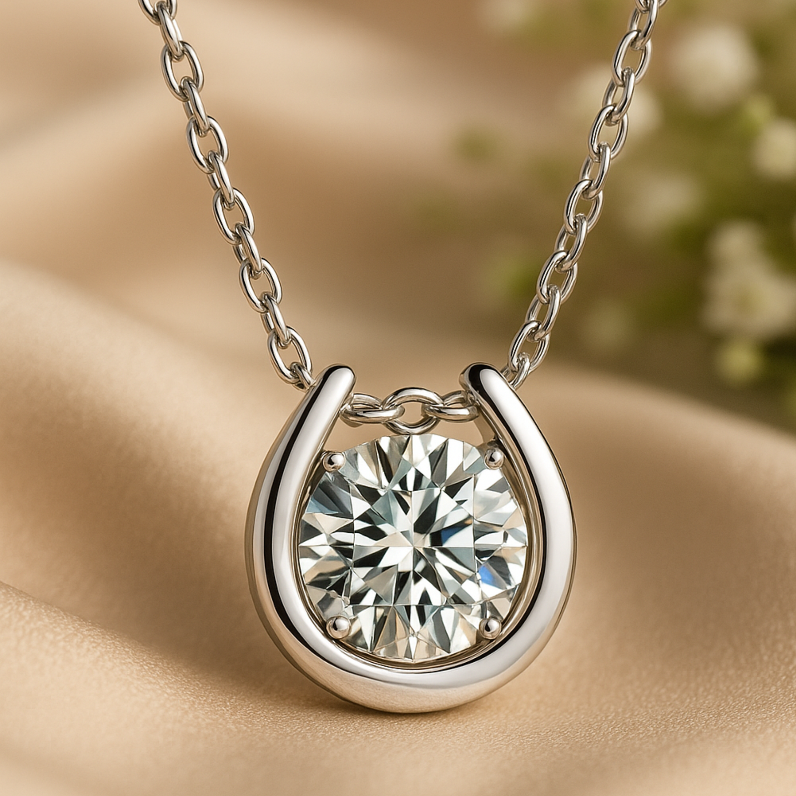 Elevate your elegance with the Lucky Radiance Horseshoe Pendant, crafted in premium 925 Sterling Silver and set with a brilliant round-cut moissanite. The smooth, modern horseshoe design symbolizes protection, positivity, and timeless charm, while the center stone sparkles with exceptional fire and clarity. Perfect for everyday refinement or special occasions, this pendant adds a touch of luxury to any look.