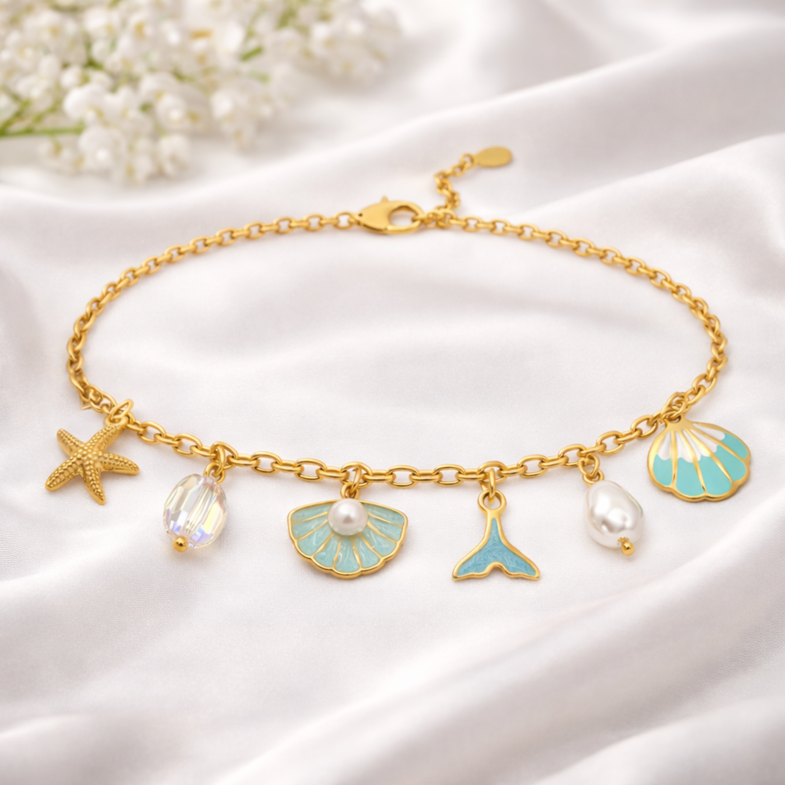 Inspired by the serene beauty of the ocean, the Marina Étoile Charm Bracelet is crafted in gold-tone stainless steel and adorned with delicately curated marine-inspired charms. Featuring an elegant starfish, iridescent crystal drop, pearl-accented shell motifs, a graceful mermaid tail, and organic freshwater pearls, this bracelet captures the essence of coastal luxury. The polished chain drapes fluidly on the wrist, while each charm adds movement, texture, and storytelling detail—making it a refined statement for sunlit days and balmy evenings alike.