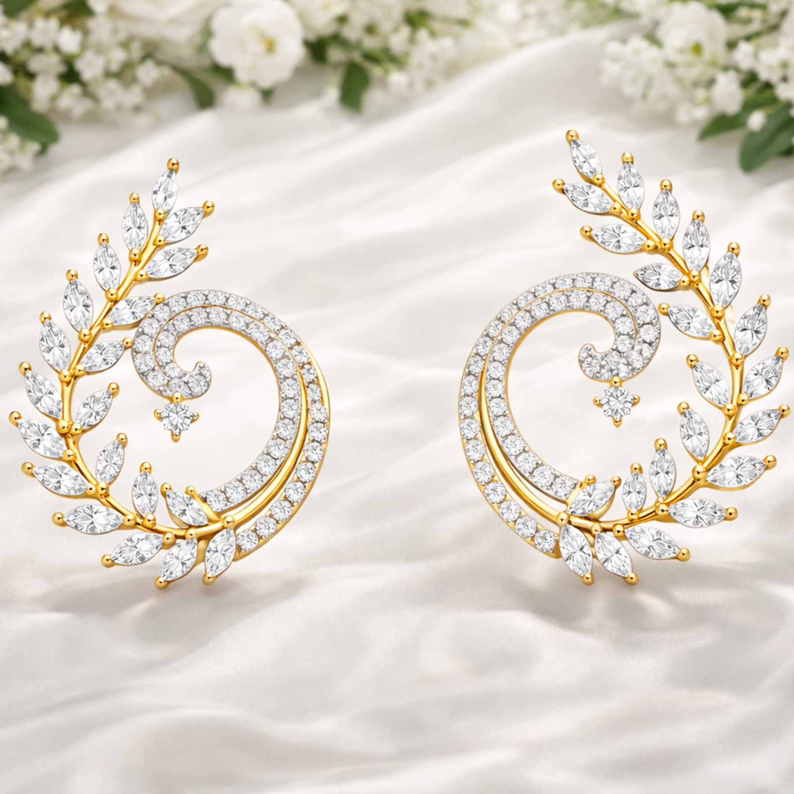 Each earring features a spiral pavé-set diamond swirl, embraced by a delicate marquise-cut diamond vine — symbolizing growth, grace, and feminine power. The high-polish gold finish enhances brilliance, while the carefully set moissanites reflect light with exceptional sparkle and fire.