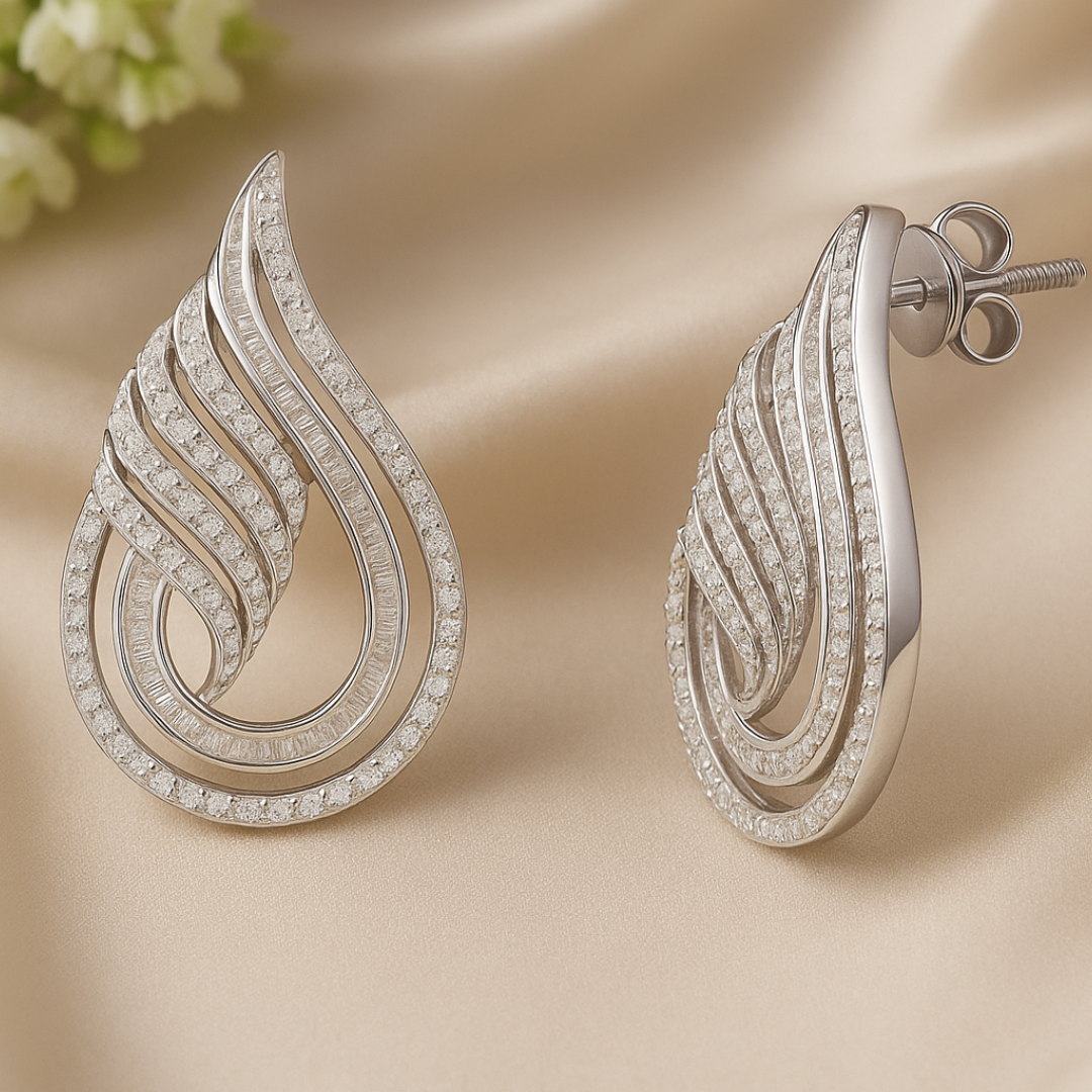Crafted in high-polish S925 sterling silver, the flowing layered design evokes elegance and fluidity, making these earrings a true statement of luxury. The intricate curves add depth and texture, while the dazzling pavé detailing brings a glamorous, red-carpet-worthy glow.