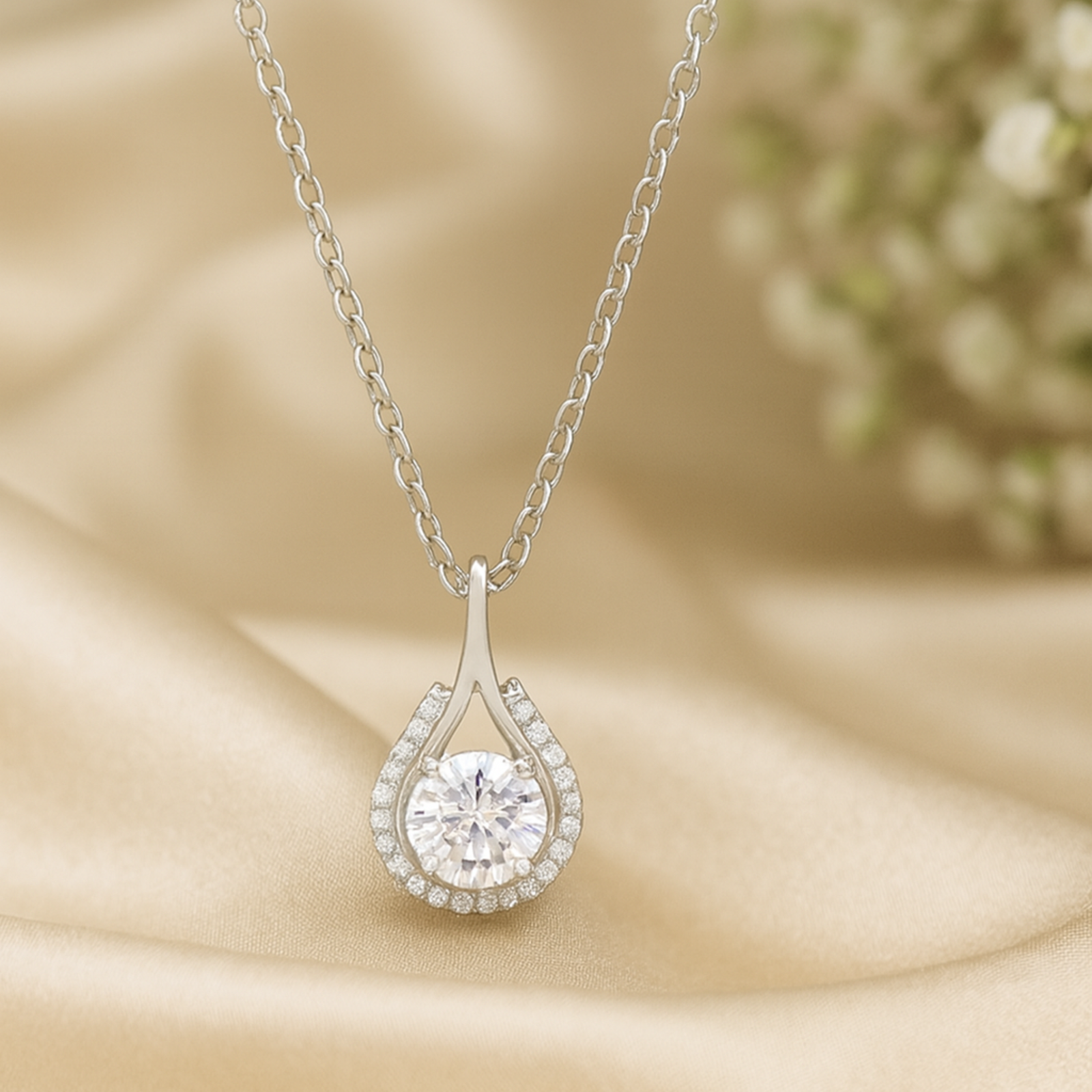 Elevate your elegance with this exquisite teardrop-shaped moissanite pendant, crafted in premium 925 Sterling Silver. The design features a brilliant round-cut center moissanite, framed by a halo of sparkling pavé stones that enhance its radiant fire and clarity. Suspended from a sleek silver chain, the pendant flows into a graceful teardrop silhouette, symbolizing purity and timeless beauty.