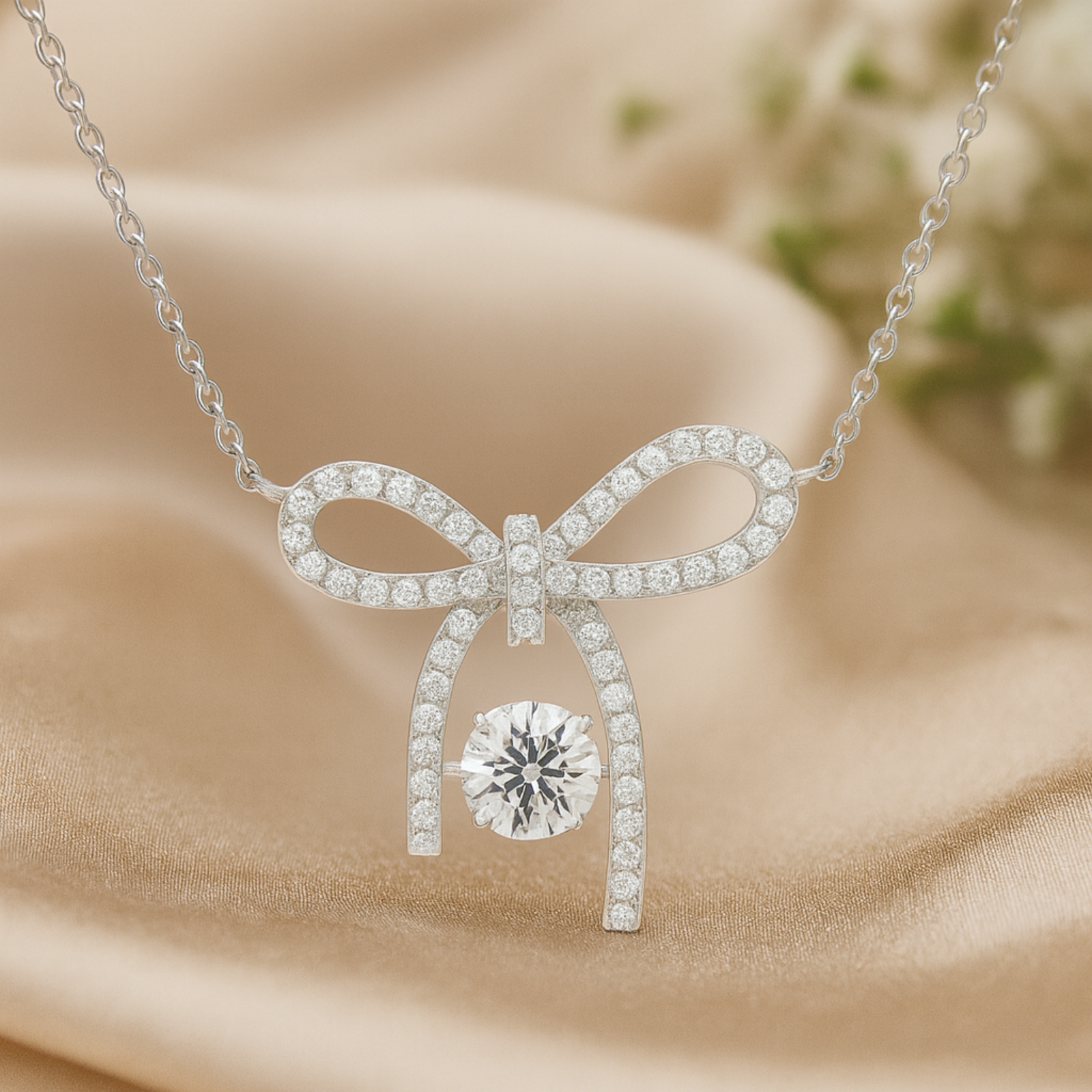 Elevate your elegance with the Moissanite Ribbon Grace Pendant, a delicate bow-inspired design crafted in premium 925 Sterling Silver. The pendant features a shimmering brilliant-cut moissanite centerpiece, beautifully enhanced by pavé-set moissanite accents that trace the graceful loops of the ribbon. Its feminine silhouette and radiant sparkle evoke a timeless luxury aesthetic—perfect for gifting, celebrations, or adding a refined touch to your everyday style.