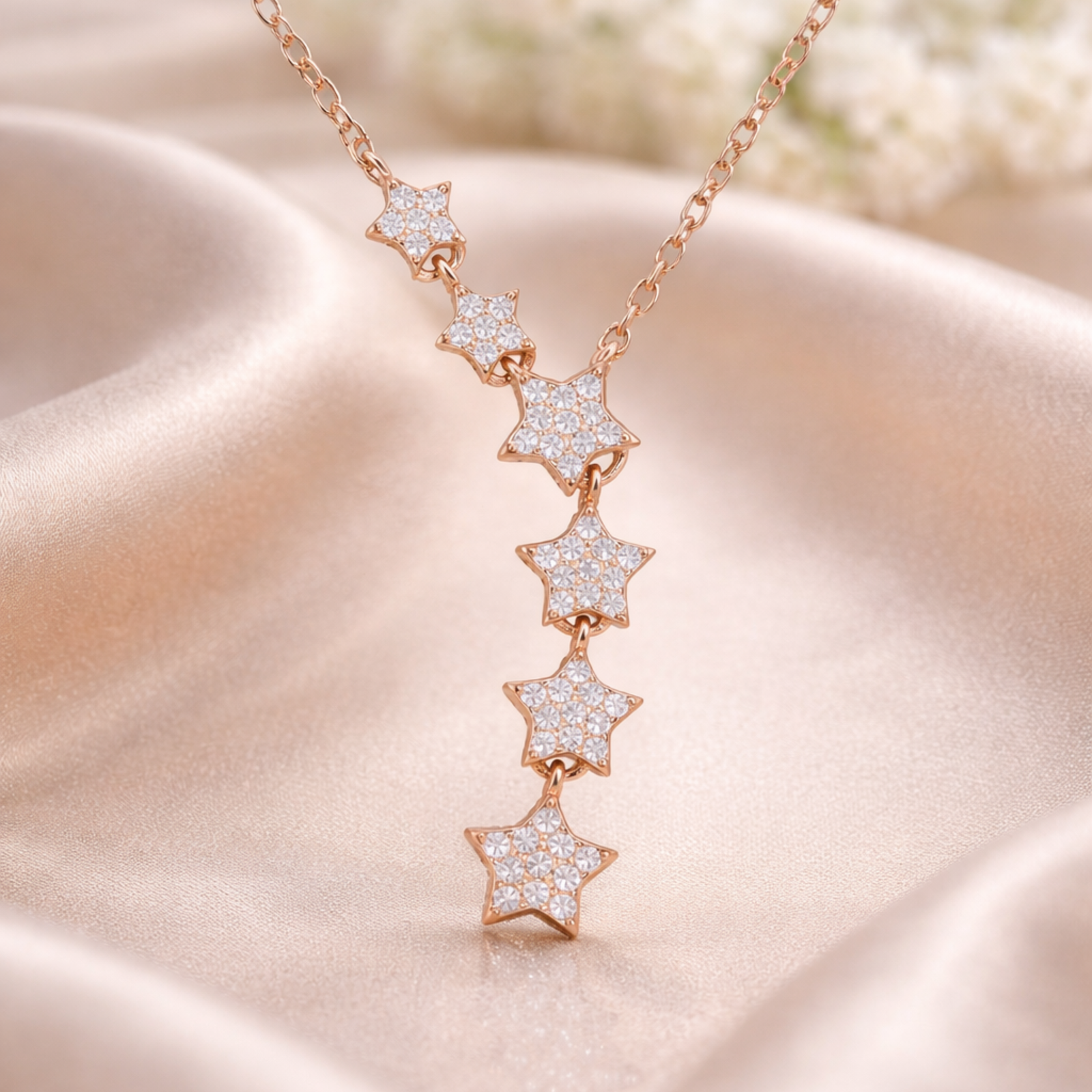 The warm blush tones of rose gold enhance the fire and clarity of moissanite, creating a luminous contrast that flatters every skin tone. The cascading star arrangement elongates the neckline, making it perfect for both everyday sophistication and evening glamour.